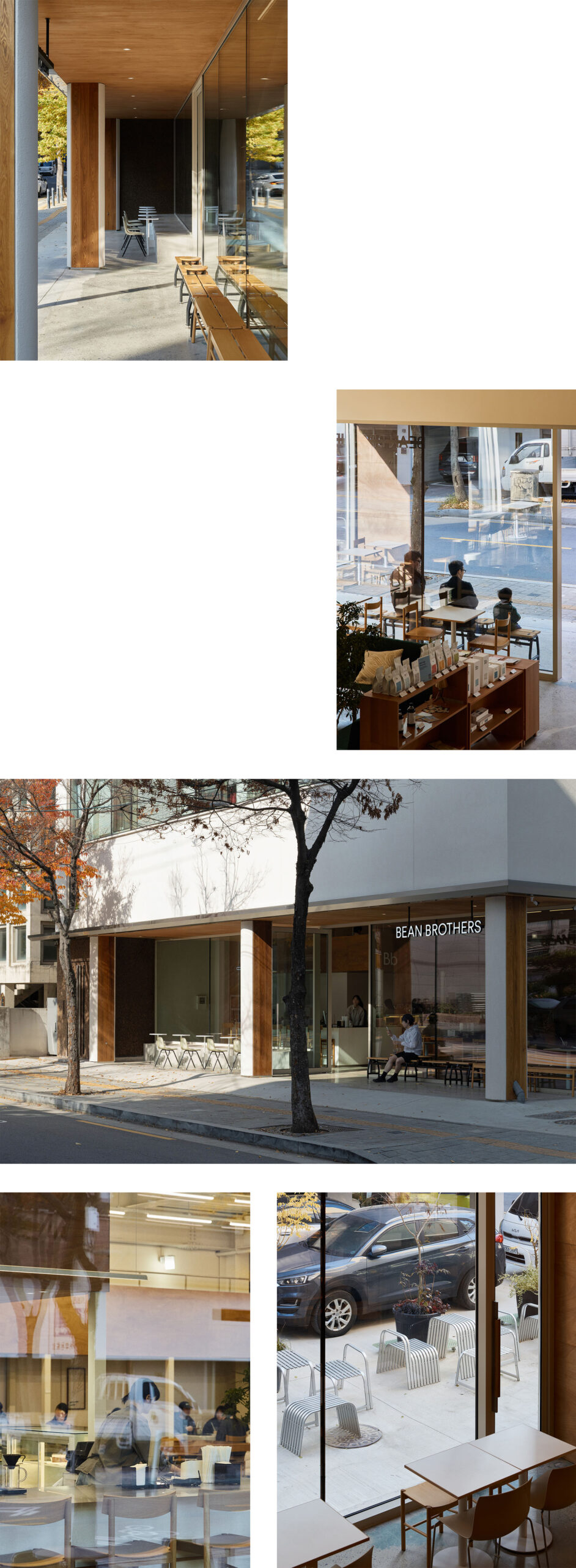한 켜를 들여 만든 깊은 처마 덕분에 손님들은 가벼운 비를 피하거나 기분 좋은 햇살을 맞으며 야외 좌석에서 커피를 즐길 수 있습니다.