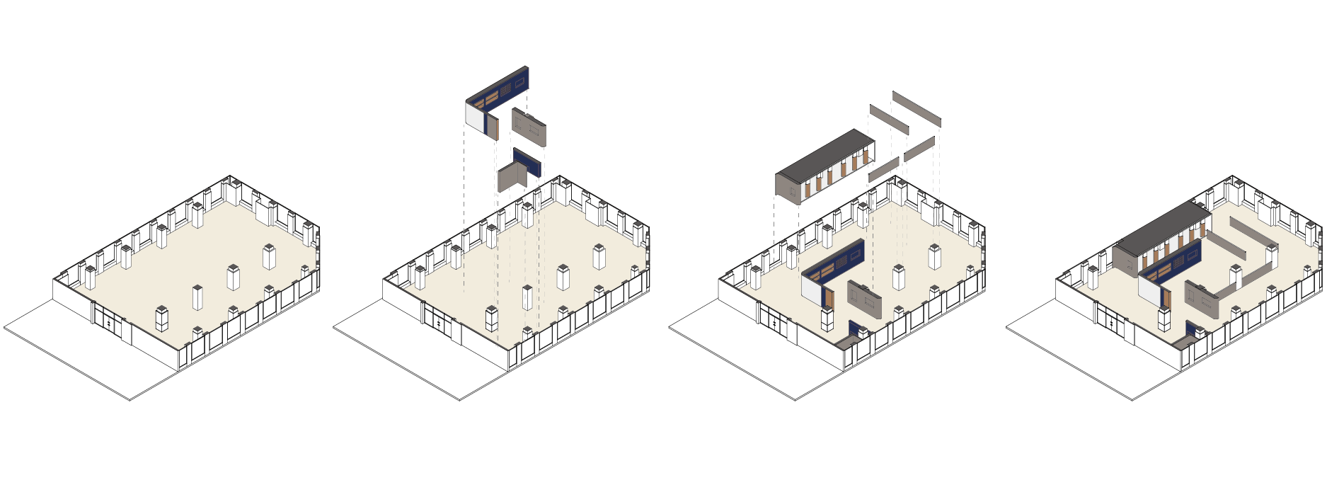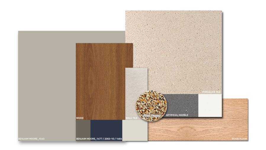 따뜻하면서 포근한 분위기를 연출하고자 했다. 웜그레이와 베이지계열의 톤을 크게 깔아주고, 포인트 요소로 브랜드 컬러인 블루를 사용하였다. 블루가 가진 느낌을 월넛계열의 우드와 융화시켜 주요 공간을 구성하였다.