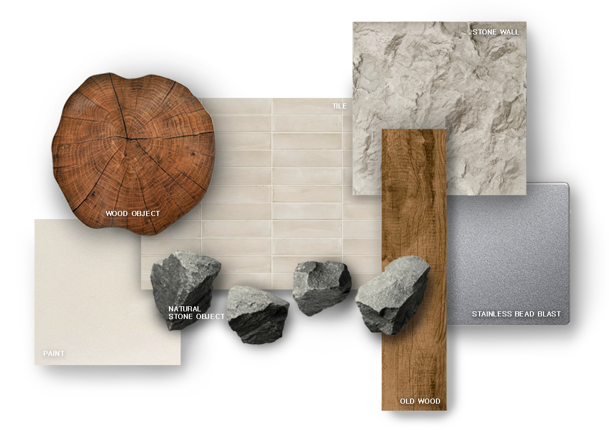 우리는 소재의 성격에 따라 세 가지 카테고리로 나누어 공간의 깊이를 설계했습니다.